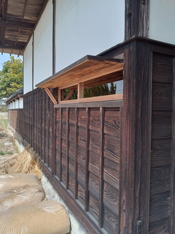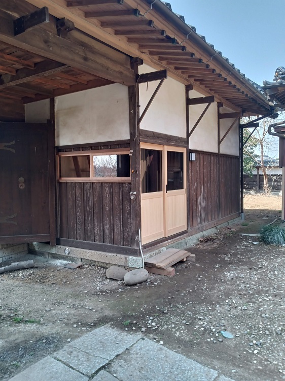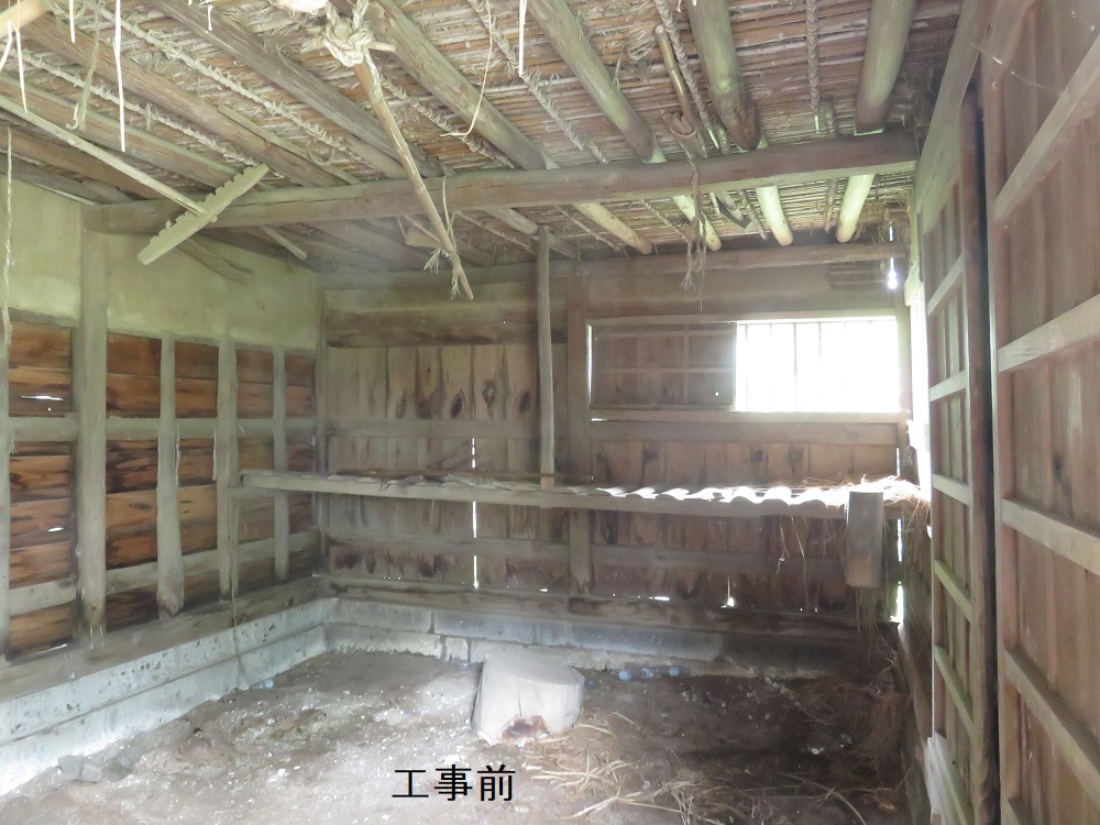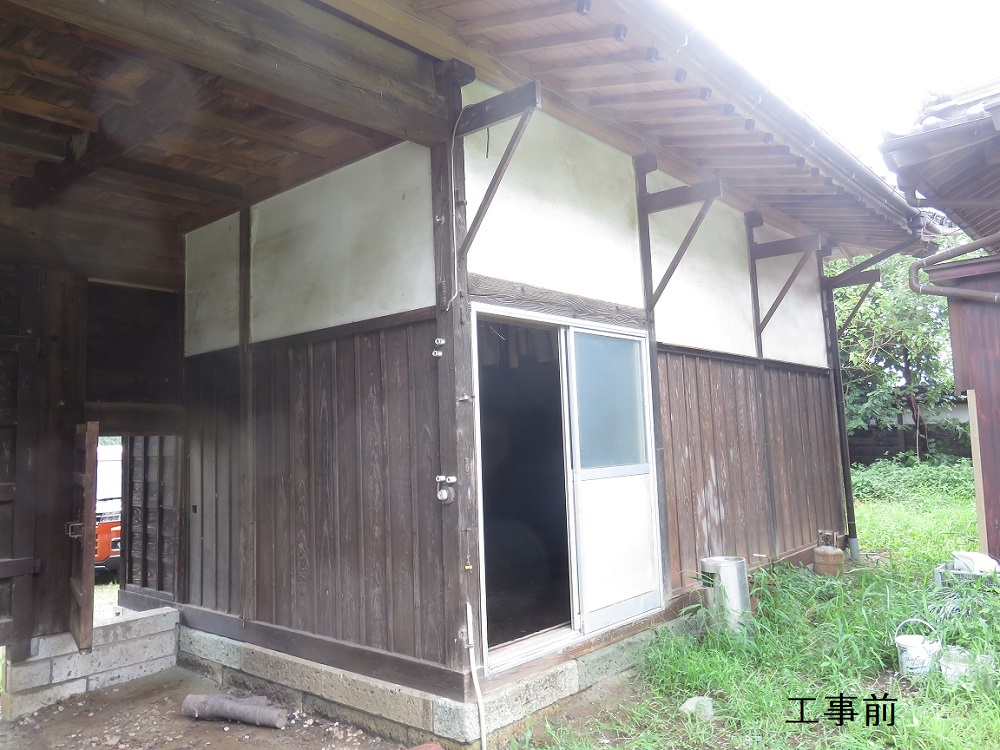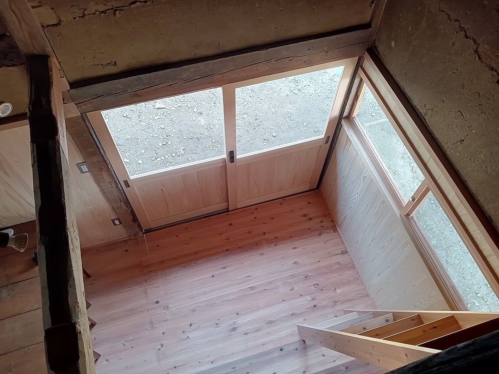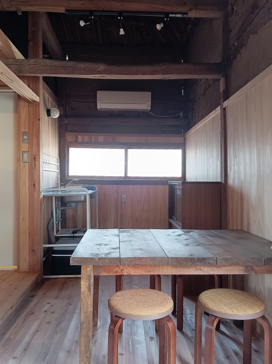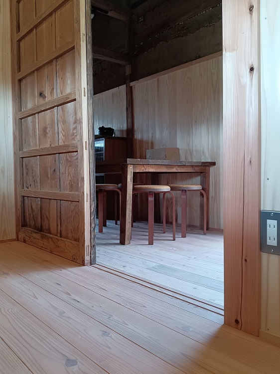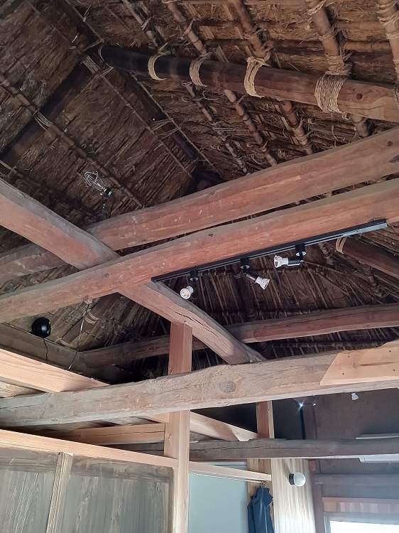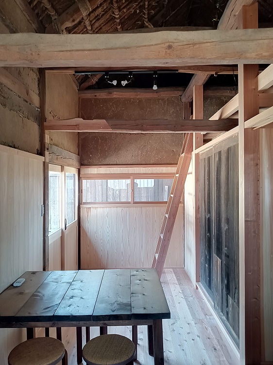 物置となっていた間口3間、奥行2間の土間スペースに床を張り、間仕切り壁を設け設備を整えました。スギ材で仕上げた床や壁は心地よく、木の風合いが美しい快適な空間に生まれ変わりました。天井を見上げた時の梁組、茅葺き屋根の下地がこの建物の歴史を感じさせてくれます。